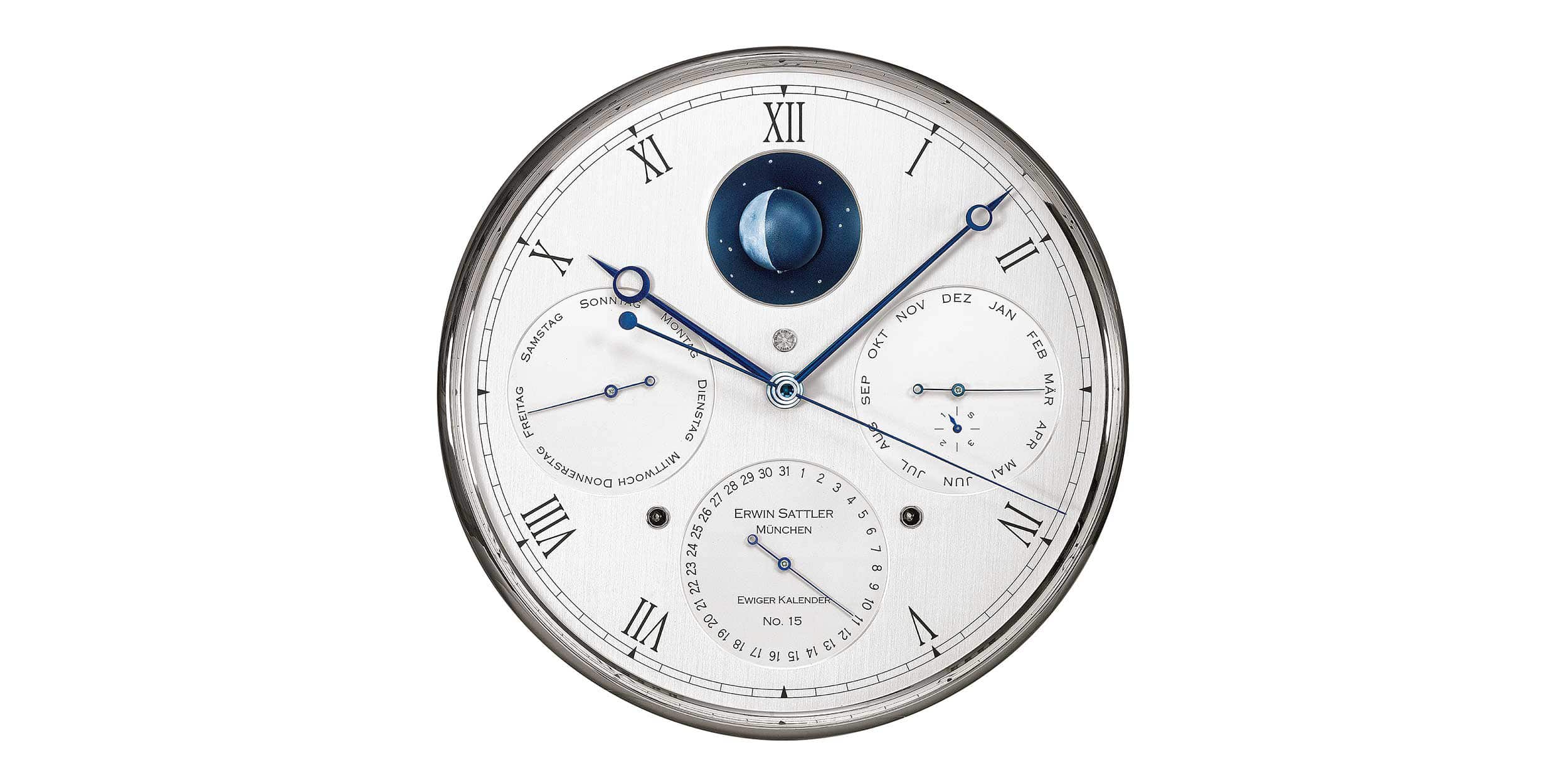 - シルバーメッキの文字盤に「パーペチュアルカレンダー」と手描きのムーンフェイズ表示、ブリリアントカットダイヤモンドがちりばめられています