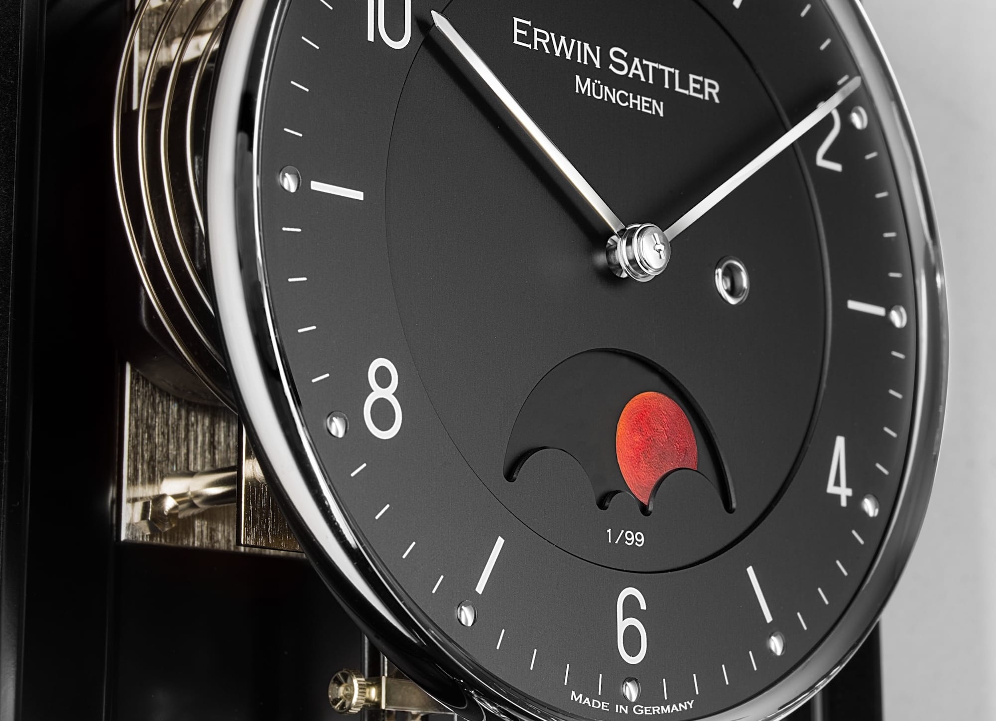 Opus PM 70 IIIのブラックアルマイト仕上げの二層構造文字盤は、特に注目に値します。12時位置の数字は、ブラッドムーンを彷彿とさせる赤色です。月の満ち欠けは、6時位置の窓から手塗りのディスクで読み取ることができます。そして毎時、心地よい穏やかな音、いわゆる「パッシング・ストライク」が鳴ります。