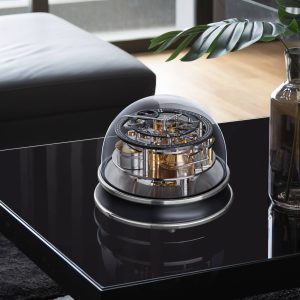 ケースは2つのバリエーションから選択でき、堅牢なメタルインレイが視覚的なアクセントを添えています。スモークガラスのフロントパネルからは、収納された時計がさりげなく見えます。2つのLEDライトが、雰囲気のある照明を演出します。電源または電池で動作するため、どこにでも設置できる柔軟性を兼ね備えています。