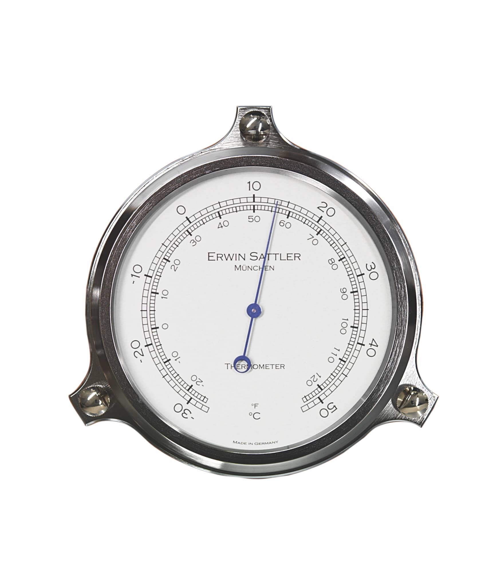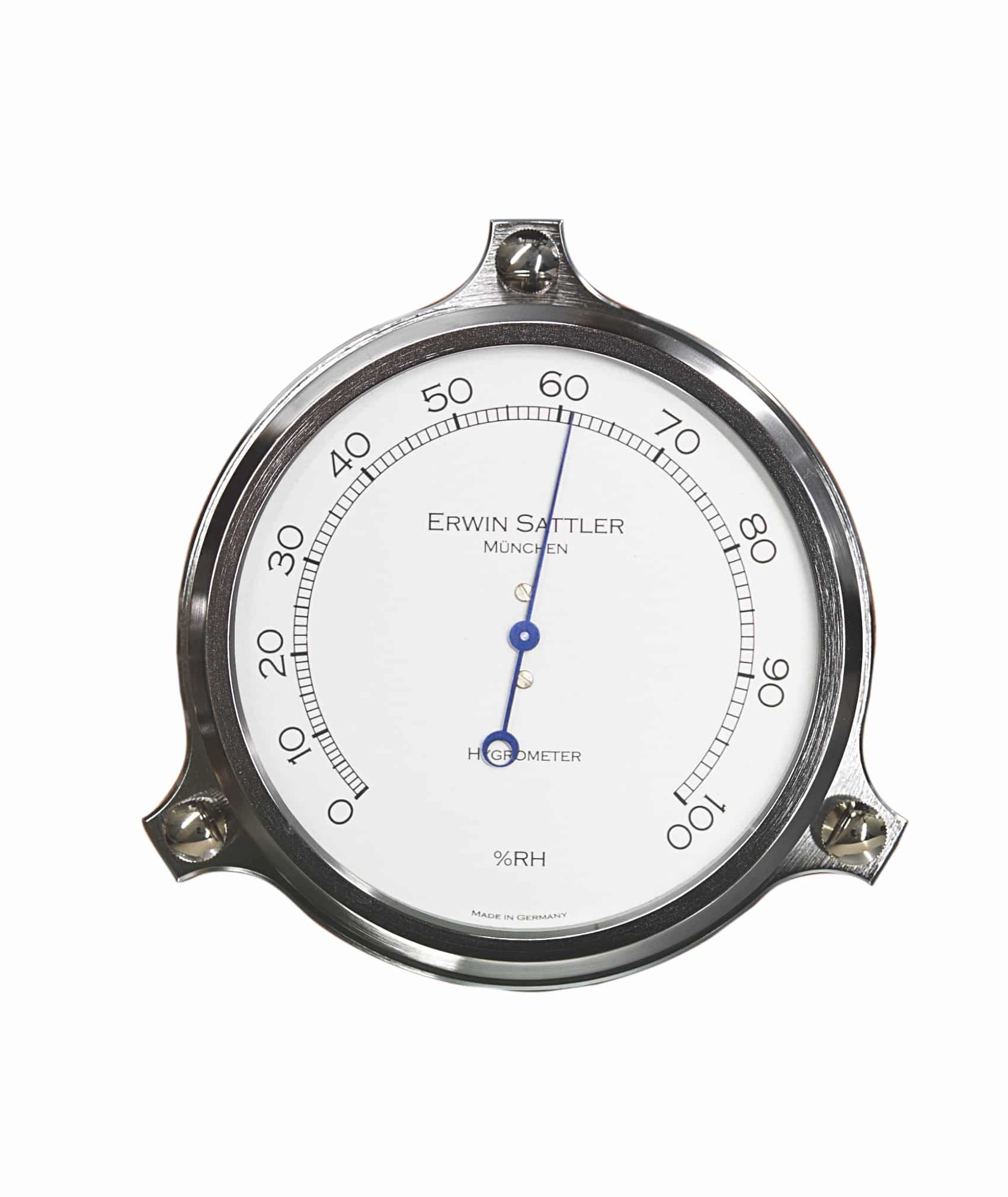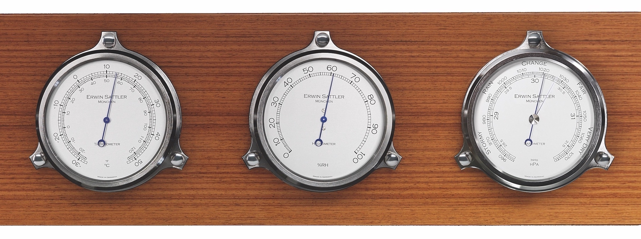 エルウィン・サトラーのミュンヘン時計工房では、3種類の測定器を製造しています:温度計、気圧計、そして高精度湿度計です。これら3点はいずれも最高級の職人技で製造されています。高品質な仕上げ、正確な測定値、そしてクラシックなデザインが印象的です。