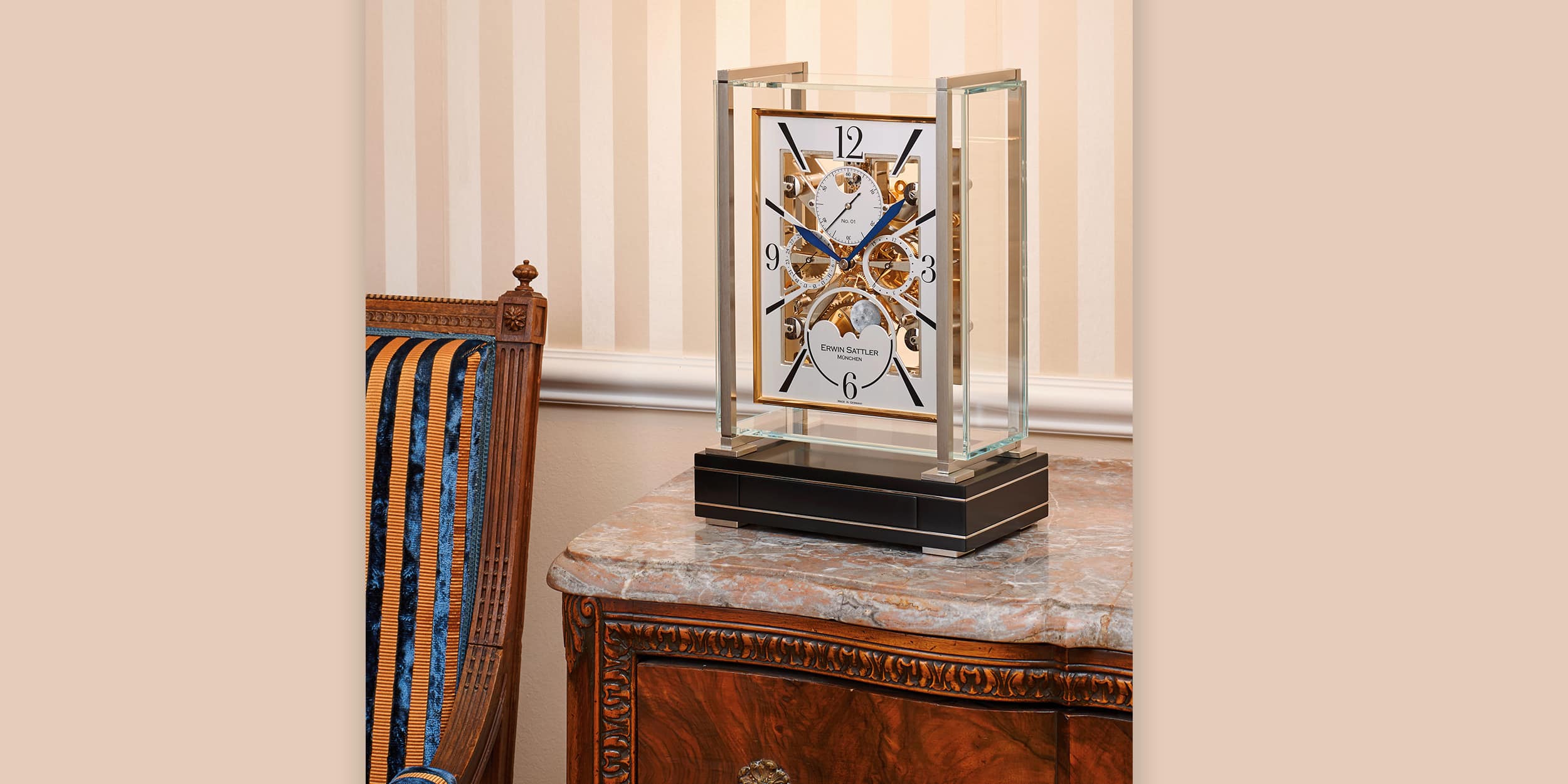何世紀にもわたり、卓上時計、マントルピース時計、コンソール時計は、洗練された上品なインテリアを構成するものとして欠かせない存在でした。外観のデザインは時代の様式と用途に基づいており、装飾的側面と機能的側面のどちらかが重視されていました。ルネサンス期の卓上時計は、時針と分針に加えて、多数のカレンダーやその他の天文表示が特徴的でした。