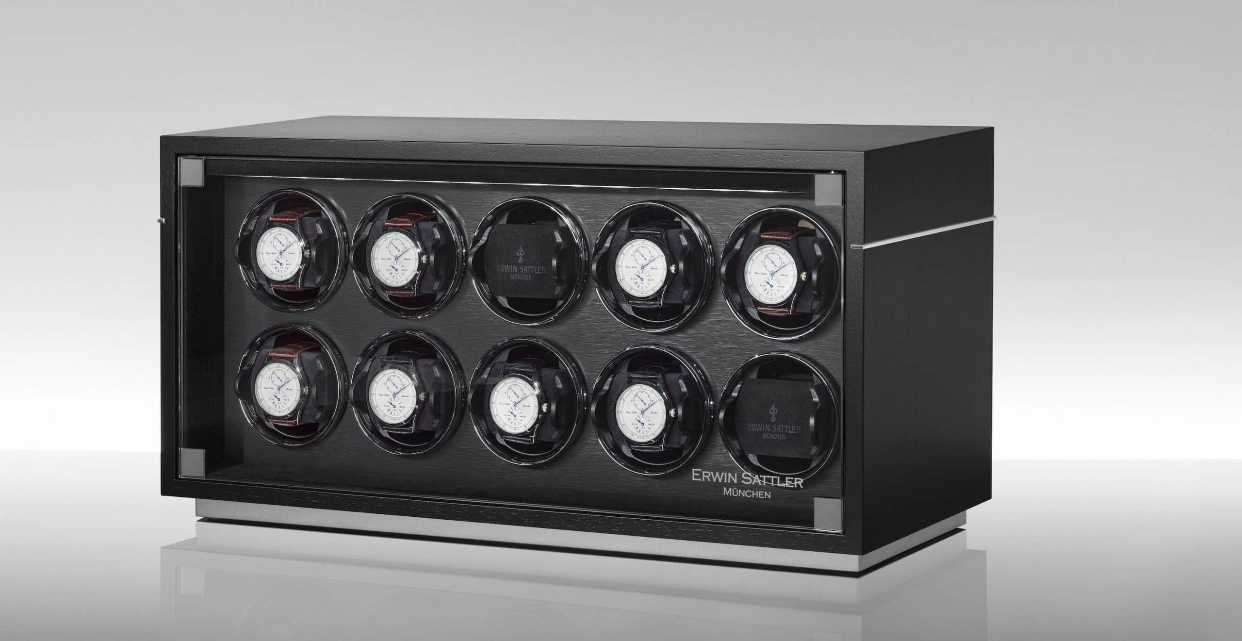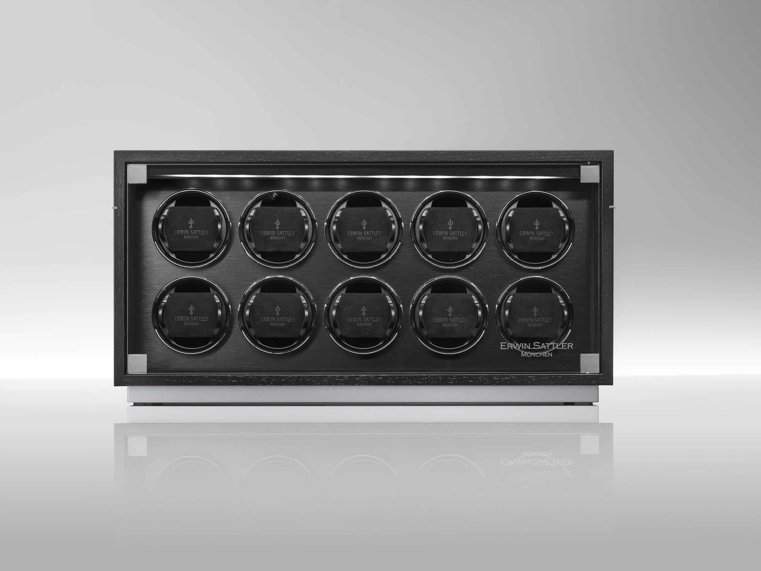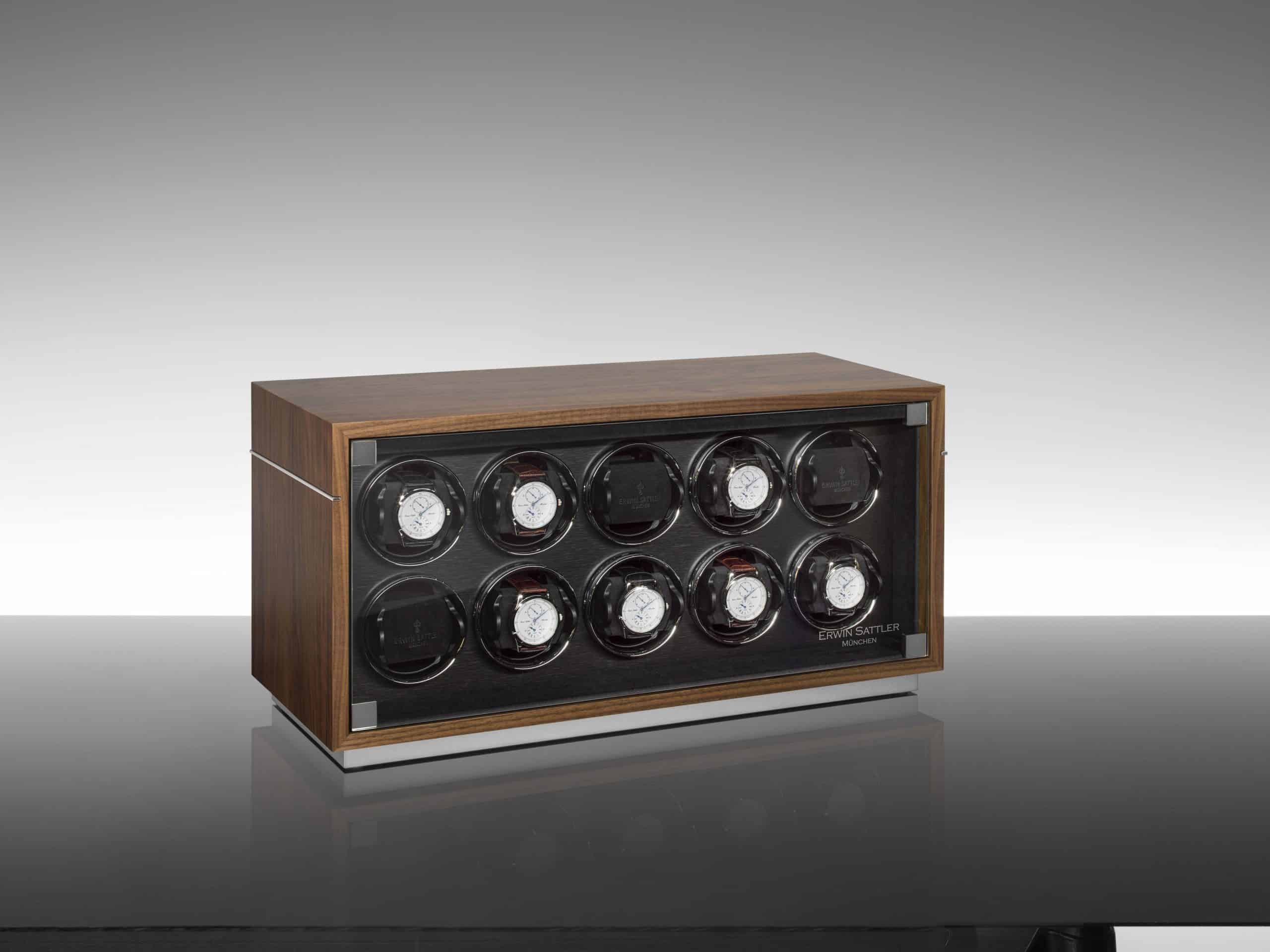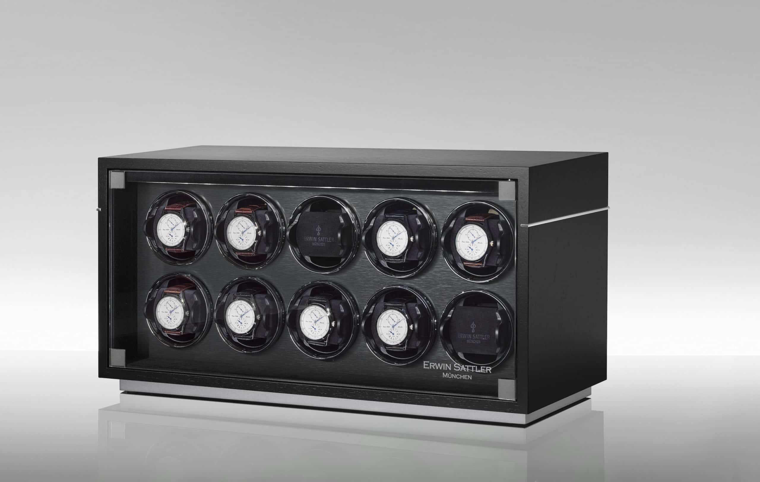 10本の腕時計がガラス扉の奥にしっかりと固定され、保護されています。それぞれのウォッチワインダーは、Wi-Fi対応デバイスでプログラム・制御が可能です。12,000種類以上の自動巻き腕時計が登録された専用データベースから、各腕時計の最適な値がウォッチワインダーのメモリに転送されます。