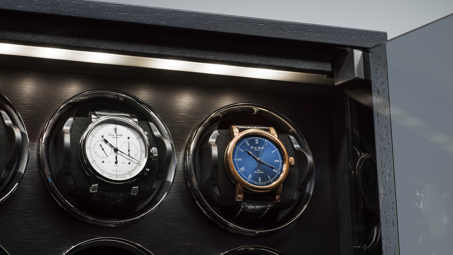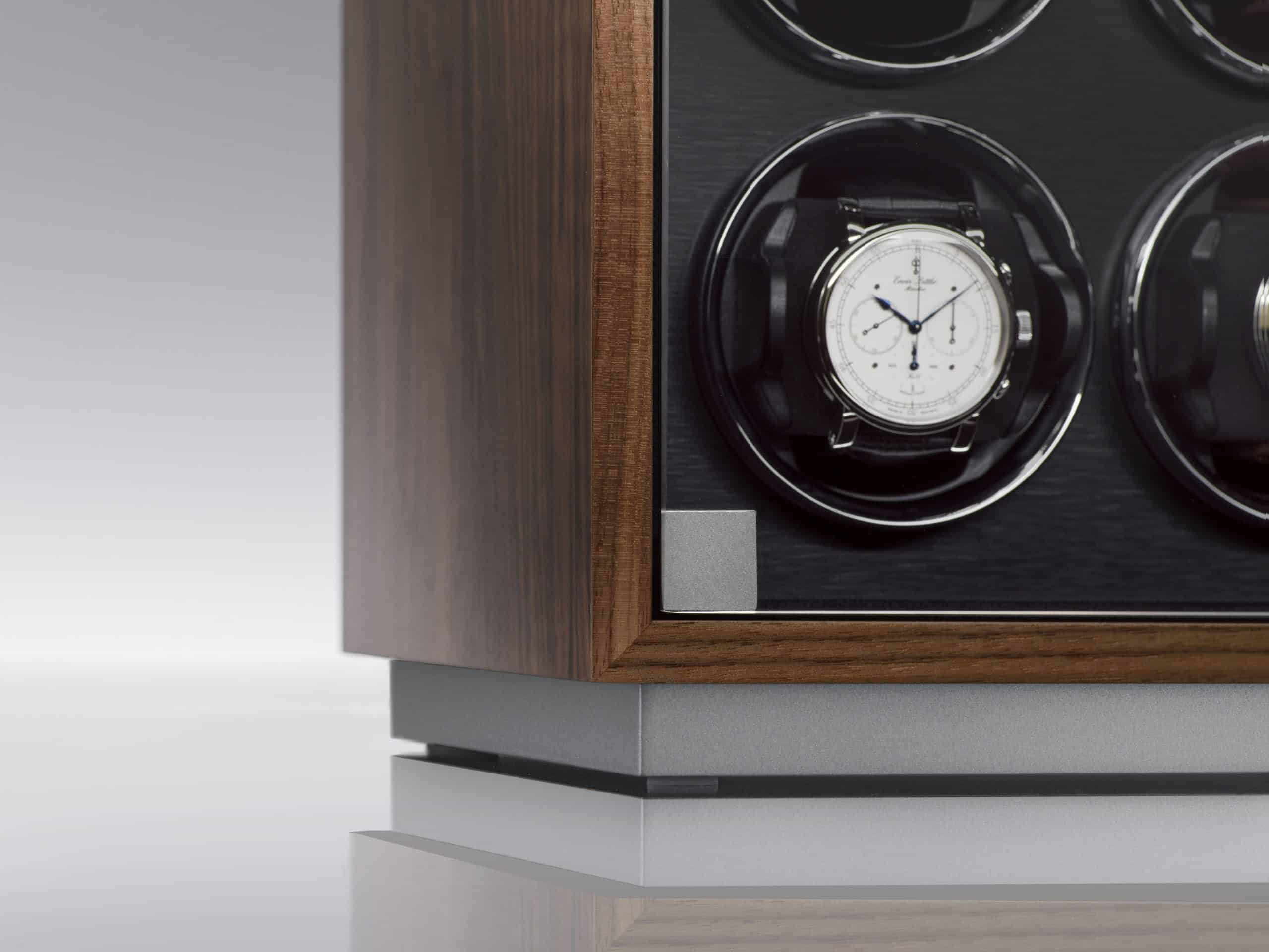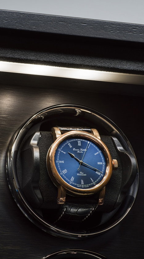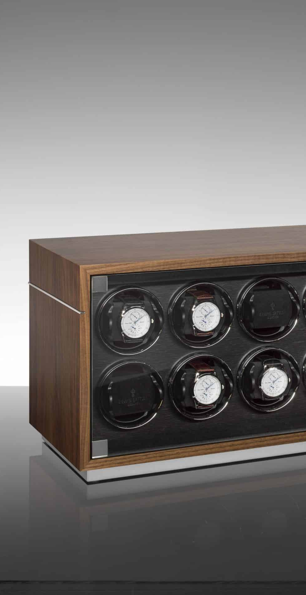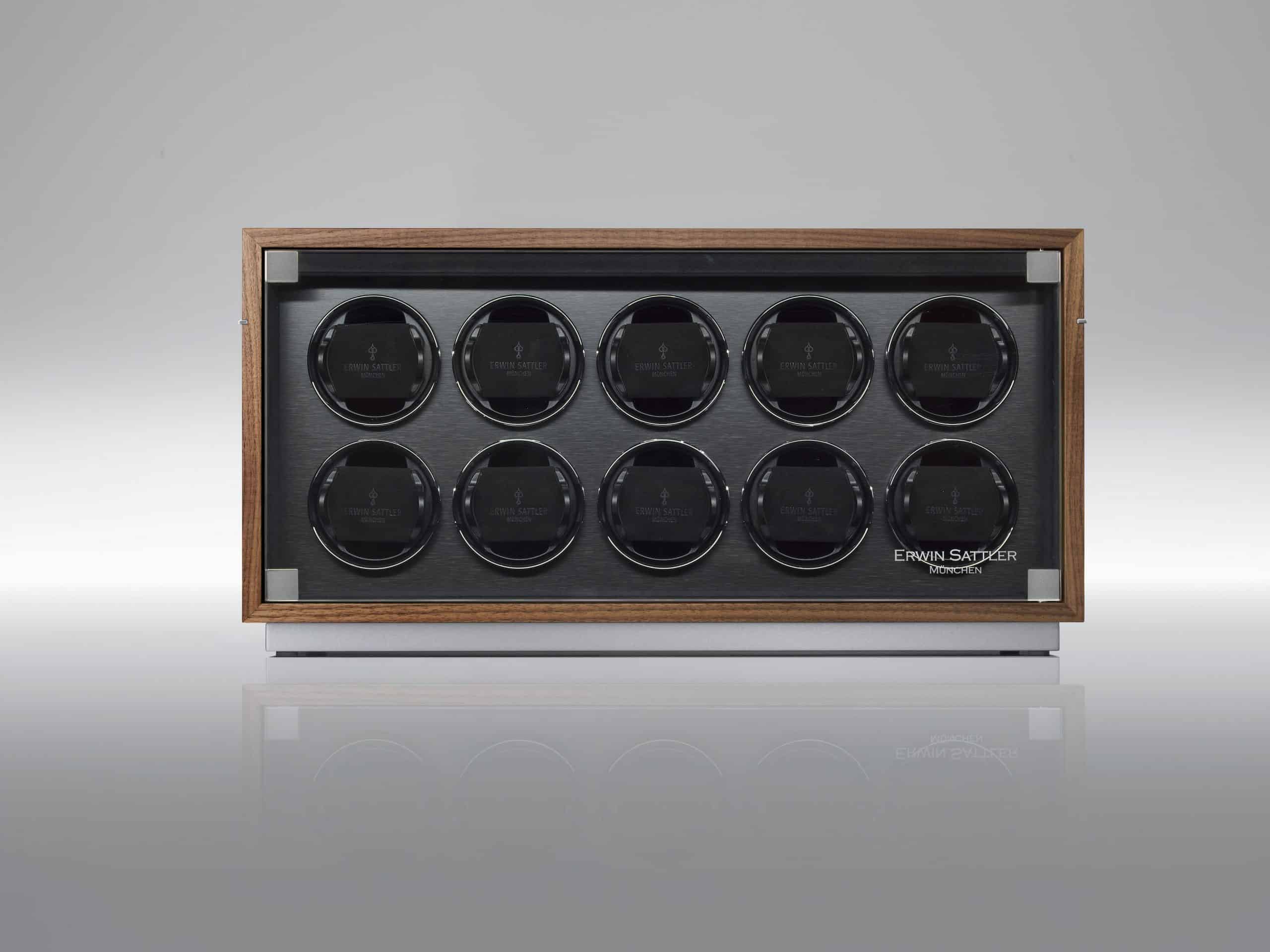10本の腕時計がガラス扉の奥にしっかりと固定され、保護されています。それぞれのウォッチワインダーは、Wi-Fi対応デバイスでプログラム・制御が可能です。12,000種類以上の自動巻き腕時計が登録された専用データベースから、各腕時計の最適な値がウォッチワインダーのメモリに転送されます。
